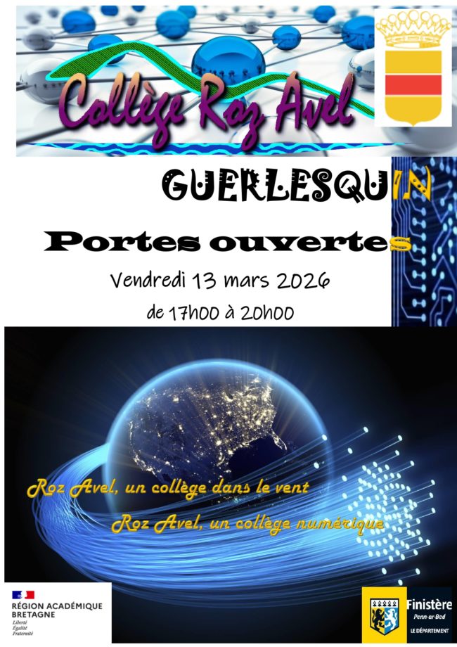 Le collège Roz Avel vous ouvre ses portes vendredi 13 mars, de 17h à 20h Les familles, futurs élèves et toutes personnes curieuses de mieux connaître l’établissement sont invités à y participer. Toute l’équipe du collège, administrative et pédagogique, sera à la disposition des visiteurs pour répondre à leurs attentes.