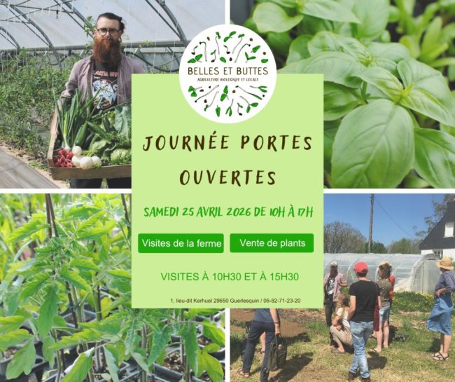 Notre maraicher bio, Aurélien Maréchal de “Belles et Buttes” vous ouvre ses portes le samedi 25 avril de 10h à 17h.– Vente de plants : potagers, aromatiques et fleurs.– Visites de la ferme à 10h30 et 15h30.Vous pouvez également retrouver les plants et les légumes :– tous les lundis matins au marché de Guerlesquin –…