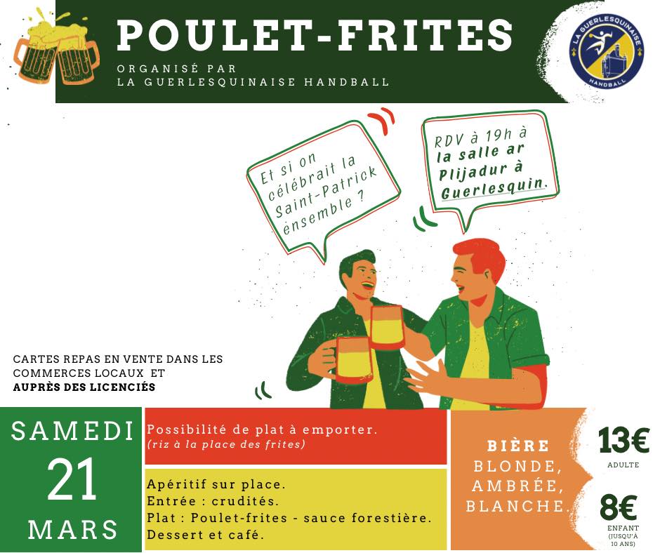 La Guerlesquinaise Handball organise un repas « poulet-frites » aux couleurs de la Saint Patrick le samedi 21 mars à partir de 19h à la salle Plijadur.