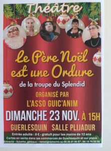 La troupe « Les bons jours ensemble » présentera dimanche 23 novembre, à 15 h à la salle Plijadur la pièce « Le Père-Noël est une ordure », une comédie créée en 1979 par la célèbre troupe du Splendide. La troupe présentera ce gros succès du théâtre de boulevard sur une mise en scène inédite d’Antoine FONDRIER. L’histoire débute le soir d’un Réveillon lors d’une permanence téléphonique tenue par SOS Détresse Amitié. Les bénévoles de ce collectif sont perturbés par…