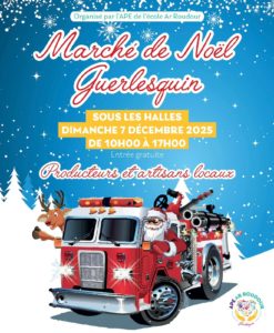 L’Association des Parents d’Élèves de l’école Ar Roudour prépare son marché de Noël qui aura lieu le dimanche 7 décembre, de 10h à 17h sous les Halles. Créateurs, artisans, producteurs locaux vous présenteront leurs créations et leurs produits. Vous souhaitez participer ? Envoyez votre demande à : ape.arroudour@outlook.com Une tombola de Noël et un concours de dessins pour les enfants sont également au programme. Buvette et petite restauration sur place. Entrée gratuite. Cette manifestation permettra le financement des projets pédagogiques, sorties…