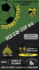 La Guerlesquinaise Football organise son 4ème tournoi de futsal, la « Red Eo Cup » le samedi 20 Décembre, à partir de 13h30 au complexe sportif Jacques TILLY avec buvette et restauration. Le tournoi est limité à 16 équipes. L’engagement est de 40 € par équipe qui doit être composée de 5 joueurs plus 2 remplaçants. Une dotation de 350 € est prévue pour les gagnants et de nombreux autres lots sont à remporter. Inscriptions par mail : 29.502212@footbretagne.org