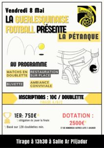 Concours de pétanque basé sur 128 doublettes minimum. Tirage A/B/C à 13h3 à la salle Plijadur Dotation de 2 500 € et de nombreux lots à gagner. 1er prix 750 € avec l'obligation de jouer la finale. Buvette et restauration sur place.